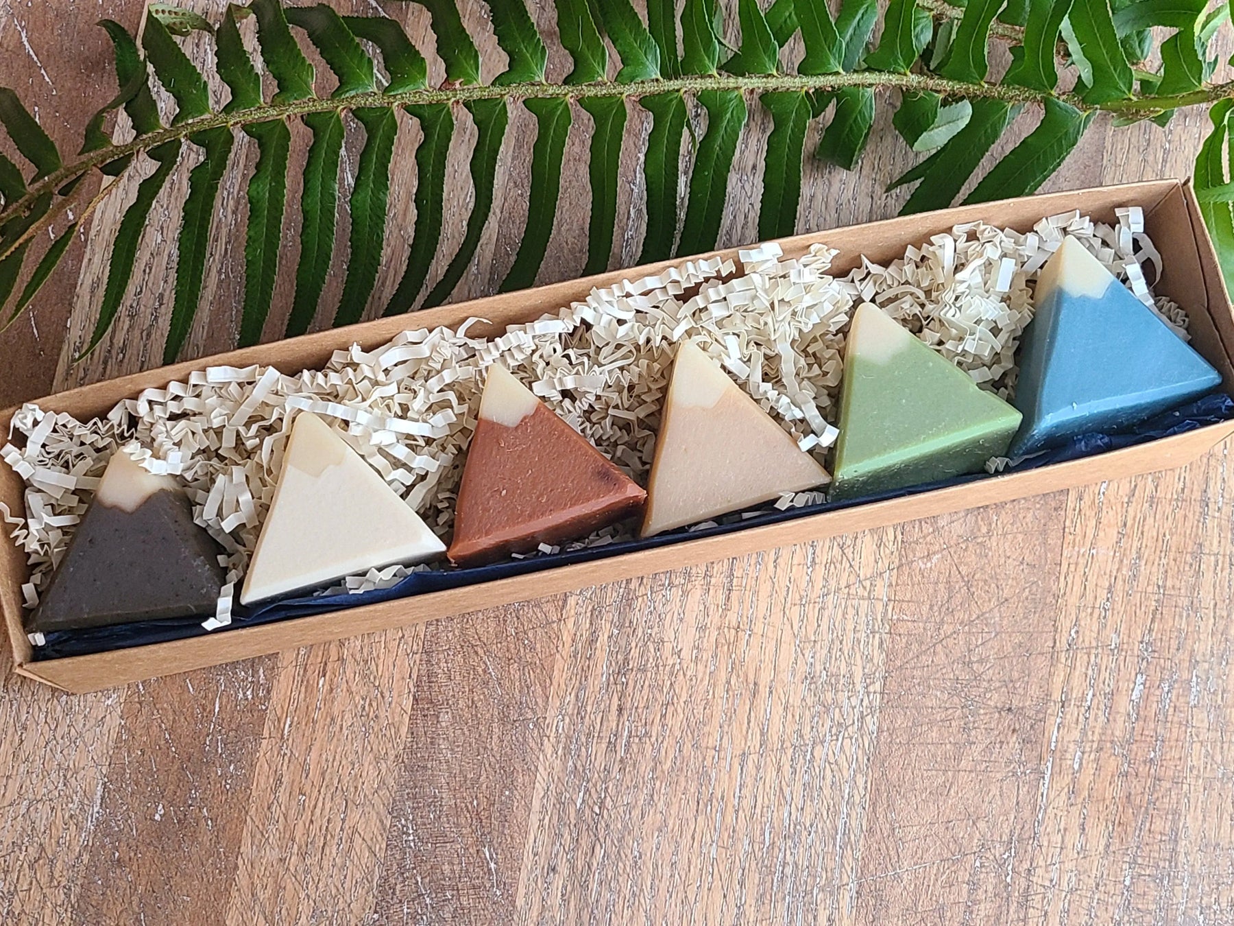 Set of 6 mini mountain soaps in a gift ready box. Soap Ingredients: Olive oil, Grapeseed oil, Coconut Oil, Goat's Milk, Sodium Hydroxide, Organic Shea Butter, Fragrance, Essential Oils, Mica, Clay, Mineral White Dimensions: bars: 2" x 2" x 1" Each soap bar weighs approx.