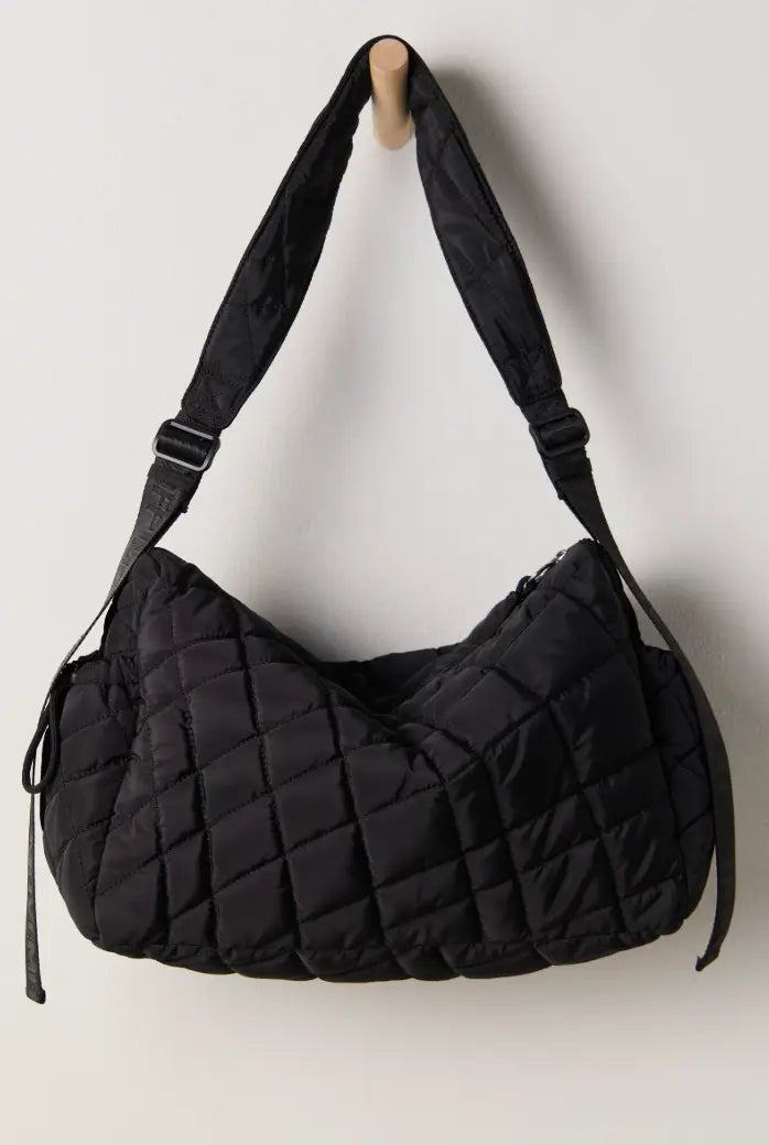 Features: Oversized style, quilted fabrication, fully lined interior, adjustable shoulder strap, interior zip pocket, drawstring-adorned side pockets